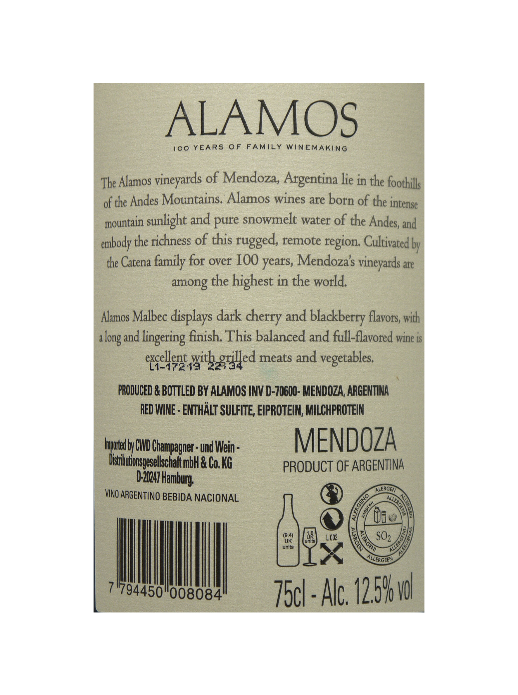 Alamos Malbec: Alamos Malbec ist eine Pracht! Auch hier ist die Handlese der Trauben Pflicht. Im Duft klingen Kräuter, Brombeeren, Cassis, Veilchen und Leder an.