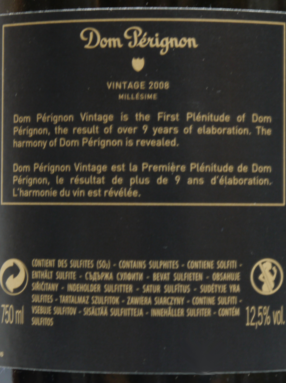 Champagne Dom Pérignon Brut Vintage 2008: Zu Anfang präsentiert sich der Vintage komplex und strahlend, mit einem Mix aus weißen Blüten, Zitrusnoten und Aromen von Steinfrüchten. Der Gesamteindruck wird durch die Frische von Anissamen und Minze verstärkt. Später entwickelt der Wein würzige, holzige und Röstaromen. Nach einer langen Phase der Zurückhaltung hat sich der Wein schließlich geöffnet. Bemerkenswert ist die perfekte Balance zwischen Nase und Gaumen. Sein schlanker, minimalistischer, purer und starker Charakter hat nun eine angenehme Wärme entwickelt. Die fruchtigen Noten sind ausgeprägt und klar. Die charakteristische Säure des Vintage ist wunderbar ausgewogen. Im Nachhall offenbart er sich vorwiegend aromatisch, rauchig und vielversprechend.